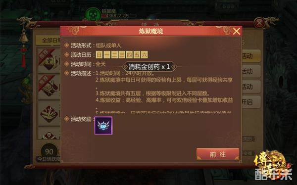 “炼狱魔境”是游戏日常活动之一,游戏玩法虽然简单,但是活动带来的经验收益却非常之高。首先活动是全天开放的,任何时候任何时间都可以进入;其次每天获取的游戏经验都有上限,一旦达到了每日经验上限,活动就会提醒,就算是击杀再多的怪物呆更长的时间也获取不到更多的经验了。
