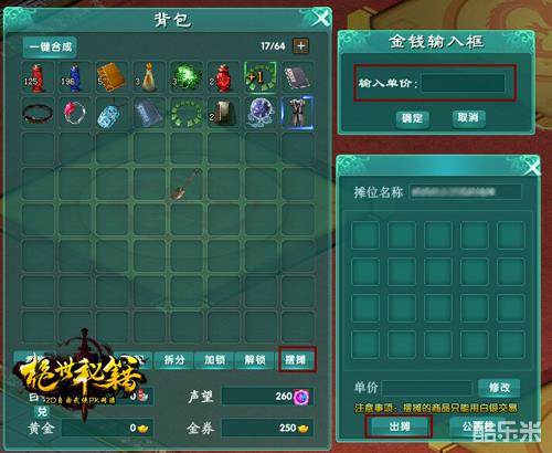 3、侠客们可将想出售的物品点击鼠标右键拖动到摊位,设置好单价后挂在摊位待售;