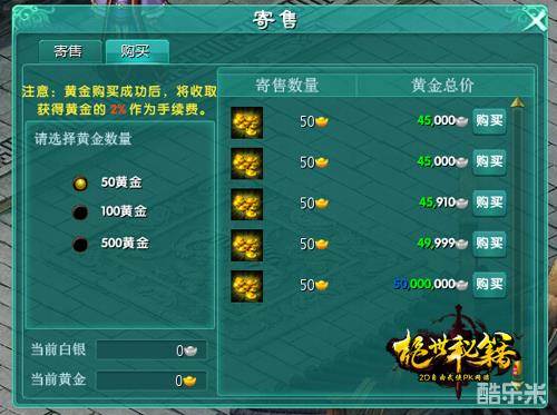在游戏中,侠客们可以在右上角小地图界面打开黄金寄售平台,在黄金寄售平台挂单出售自己的黄金给其他侠客,从而换取白银;也可以在黄金寄售平台购买其他侠客所挂单的黄金,当侠客们购买或者出售黄金成功之后,可以在邮件领取到相应的黄金或白银。
