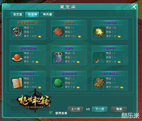 3、藏宝阁中,在宝芝堂可以购买回复药,在珍宝阁可以购买装备升级消耗品等,神兵谱可以购买武器外装。