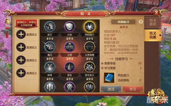 需要注意的是即便自身学习的技能再多,每一位勇士也只能使用一个技能的激活属性为全体结义成员的属性进行提升。不过好在我们在结义后可以看到其他人所携带的结义技能,理论上5位结义金兰的勇士若在同一地图将会获得5条激活属性,瞬间提升了各项能力属性。