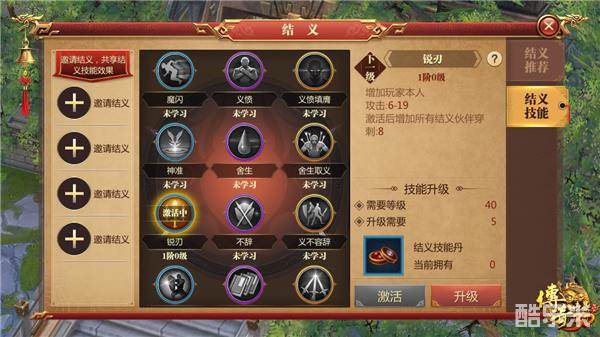 其二则是结义技能,在游戏中结义技能拥有两种属性,分别为个人属性和激活属性,个人属性只能为大伙自身带来加成,而激活属性则可以共享给所有结义伙伴。不过每个伙伴只能激活一个结义技能,为了最大化提升结义伙伴的收益,在选择激活技能之前,可以和其他伙伴商量下,避免出现重复的问题。除此之外,在战场中如果激活结义的伙伴死亡,那么该结义的效果将无法共享,除非是该伙伴重新回到大伙的身边。