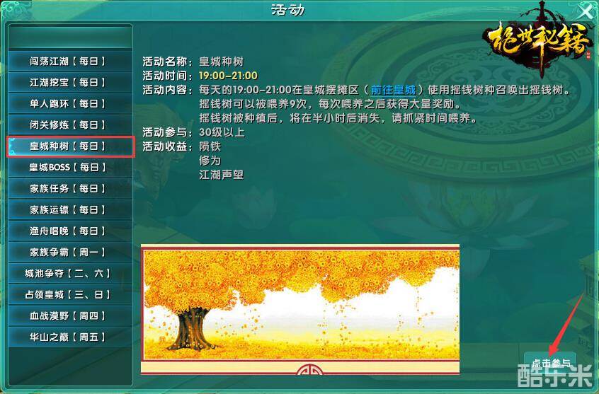 1.每天19:00~21:00时,在皇城摆摊区种植摇钱树;