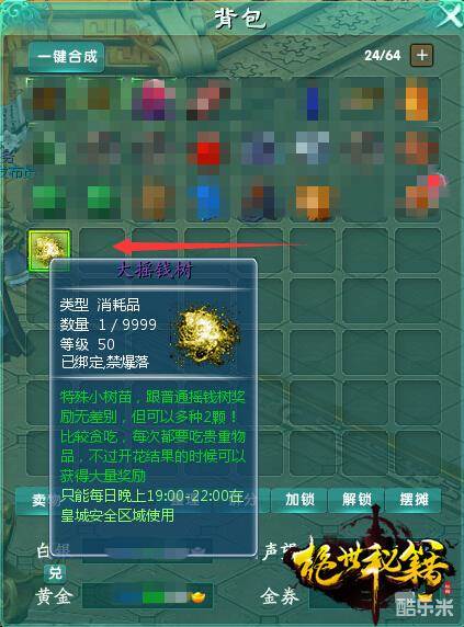6.喂养摇钱树的道具,可通过击杀任意闯荡江湖地图的任意怪物获得。
