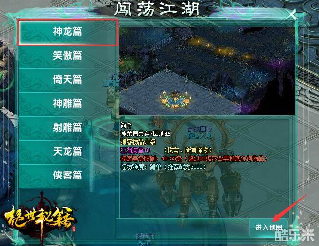 在主城(51,44)有一名叫江湖百晓生的NPC,他就是我们游戏里面的打宝地图传送NPC,游戏一共有7个打宝区域,分别是神龙篇、笑傲篇、倚天篇、神雕篇、射雕篇、天龙篇和侠客篇。