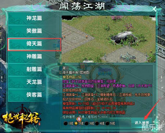 在主城(51,44)有一名叫江湖百晓生的NPC,他就是我们游戏里面的打宝地图传送NPC,游戏一共有7个打宝区域,分别是神龙篇、笑傲篇、倚天篇、神雕篇、射雕篇、天龙篇和侠客篇。