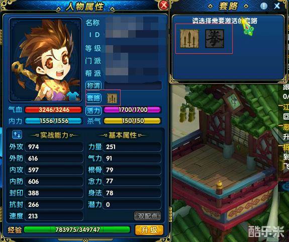 玩家点击自己头像,弹出人物属性界面,中间有套路图标。