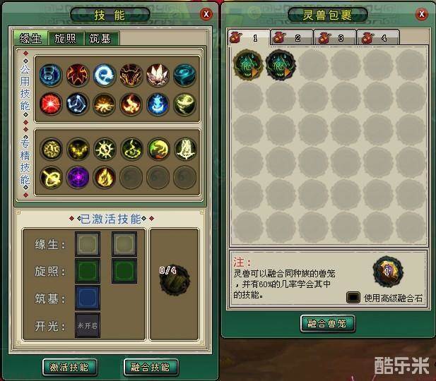 灵兽能够融合同种族的灵兽宝宝,并有一定几率学会其技能栏中已经点亮的技能。
