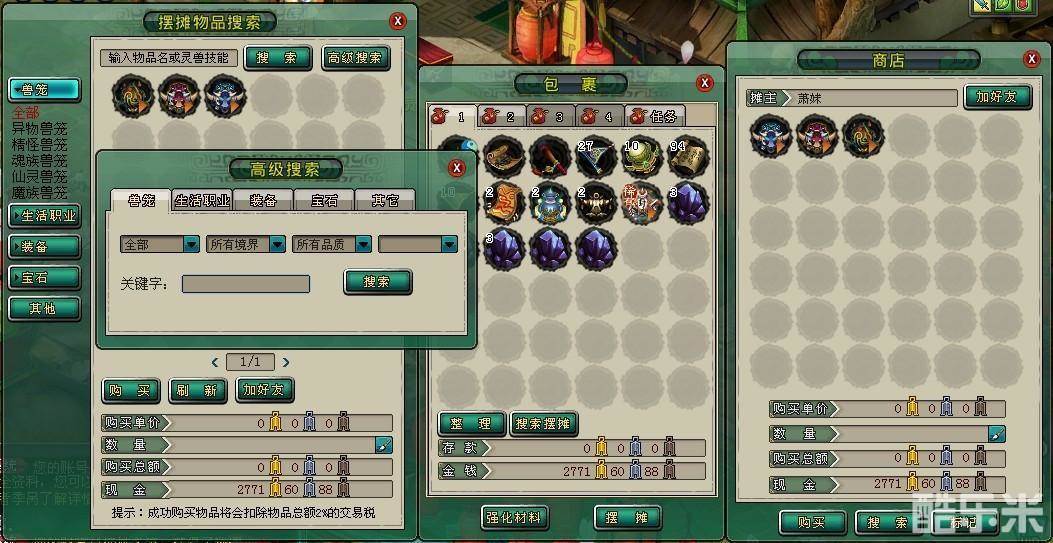 1、玩家可通过包裹界面“搜索摆摊”或摊位界面的“搜索”按钮来进行摆摊搜索操作;