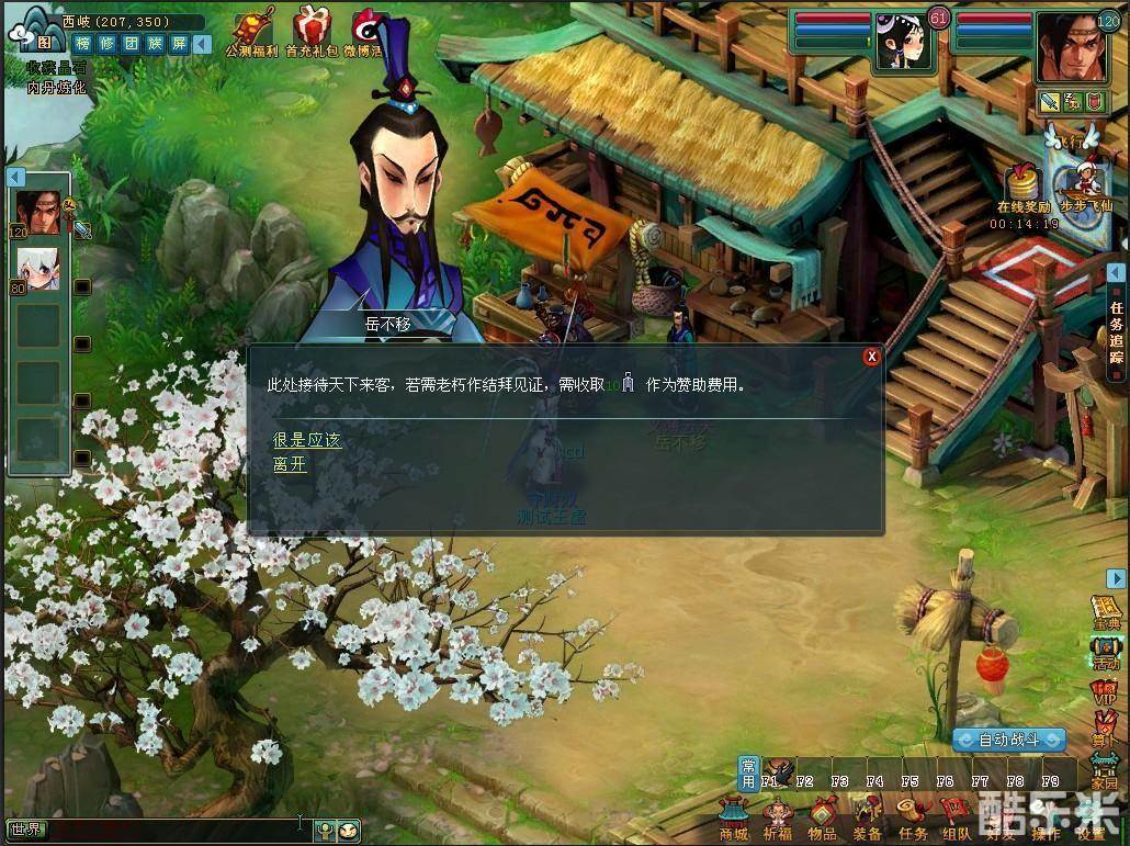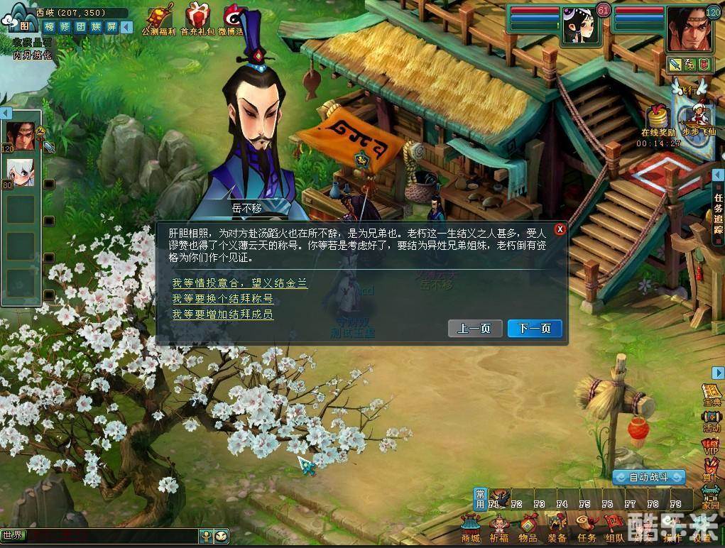 1、与结拜好友组队,到岳不移(西岐210,350)处花费10银即可进行结拜。