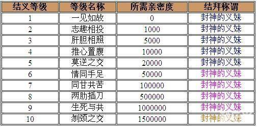 1、结拜后,结拜成员间将拥有多个结拜称谓。其中,1个称谓为江湖名号共用称谓,另有数个个人称谓。例如:封神的义妹、封神小妹的义兄等。