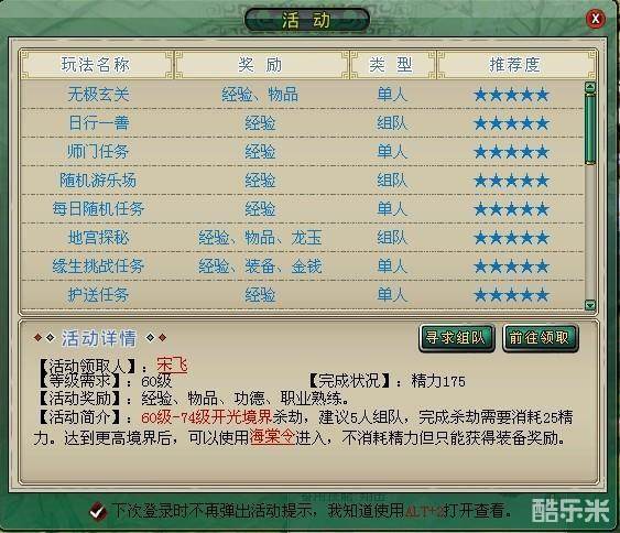 玩家可通过alt+2的“活动”界面中,选中想要完成的多人任务或活动进行“寻求组队”操作,来寻找符合条件的成员自动组队。