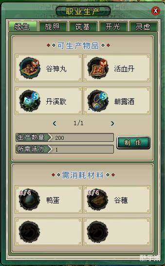 在生产界面中会自动显示玩家当前可进行生产的物品种类,选择后即可消耗材料和活力进行生产。