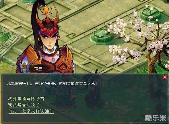 被禁言后,需要累积在线一定时间,再找NPC杰进(西岐113,352)缴纳一定金钱解禁。累积在线时间、缴纳金钱与被禁言次数有关。