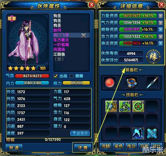 伙伴的基本属性和人物一样,分为力量、气力、根骨、念力、身法五大类。升级后也和人物一样,可以获得5点潜力点随机分配到属性上面。另外,伙伴的属性成长还会受到伙伴资质的影响,对应的资质越高,升级后属性点也能获得更大的加成。