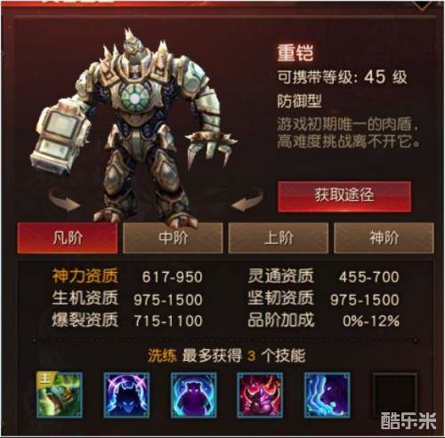 基本定位:第一只黄色品质的肉盾灵兽,整体上是重铠的加强版。