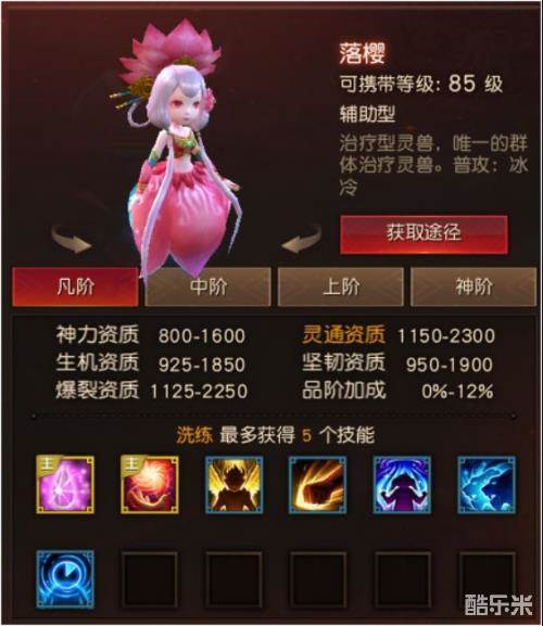 基本定位:比虹猫更稀有,但能力更强的治疗宝宝,拥有稀有技能治疗链,没有技能书可以学习的哦,只有落樱会这个技能。群体治疗最强(也是唯一啦)