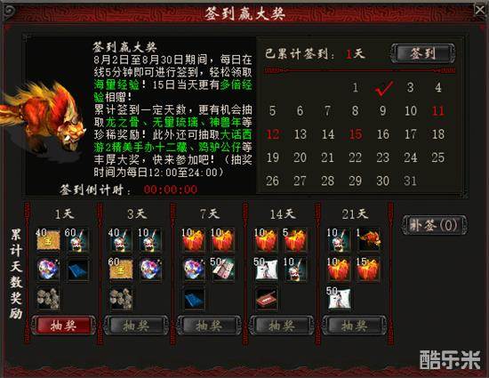 此外,8月11日、12日、15日当天,签到即有机会赢取至尊包公仔、大话2主角手办等精美实物奖励;累计签到满1、3、7、14、21天,更可抽取珍稀神兽、手办12藏、精美鸡驴挂件等豪华大礼!