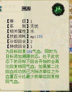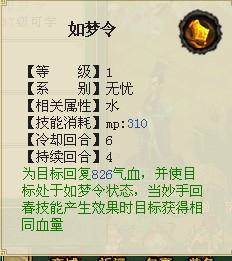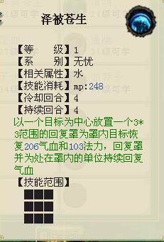1、加血罩子。可以罩住3*3范围的队友,在罩子里面的队友,每回合结束都会自动恢复气血,首次使用该技能还可以加一定量的魔法值。罩子持续4回合,技能CD4回合,所以基本上,河洛医生的罩子是可以一直持续的。