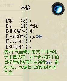 2、水镜。河洛医生的神技之一,一次给气血最少的4个目标加上水镜效果,在该效果下,可以吸收大量的伤害,当吸收到一定程度水镜会消失,消失的时候恢复一定量的气血。