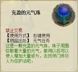 1、使用限制:21级以后才能使用,完成元气任务的24小时内不能在师门处吸收元气珠,该时间会叠加;