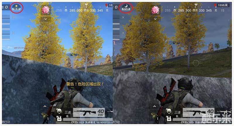 白昼黑夜的交替变换是黑夜出击Plus最大的特色,该模式默认中队模式进入,使用飓风半岛地图。上图为昼夜交替的加速动图,同一场景下的白昼与黑夜,是对荒野精英的战术策略、操作技巧和战局意识一次更大的考验。
