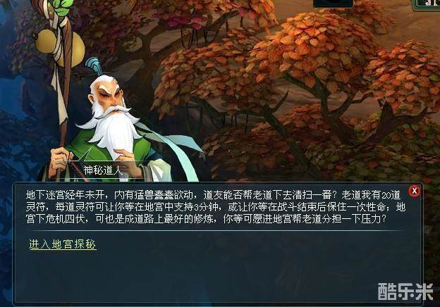 1、组满5名60以上玩家来到黄花山(40,2)寻找npc神秘道人,点击npc进入地宫。
