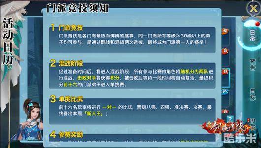 此活动在每周一的21:00正式开始,同一门派所有等级30级或30级以上的弟子均可参与。混战结束后再次参加的少侠将无法获得参与奖励。门派竞技的竞争要通过晋级赛(混战)和淘汰赛(单挑)两个大阶段。混战阶段分三场,单挑阶段分为16强、8强、4强、半决赛、决赛,最终得出本届“新人王”的称号,新人王拥有白金荣誉和每月一号选取门派大师兄/大师姐的资格。