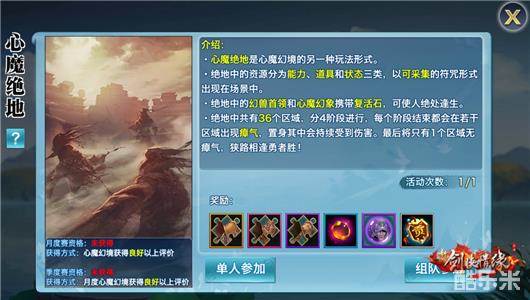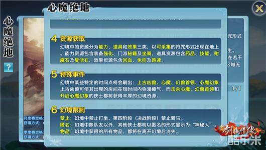 心魔幻境开启当天的20:30场的心魔幻境为绝地版,井与心魔幻境共用活动次数。参加绝地版可以达成心魔幻境的武林荣誉段位,也能获得月季年度的比赛资格。月度、季度及年度心魔幻境暂不开启绝地版。