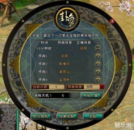 等级到达30级开启,玩家可以对系统下一次幸运宝箱(挖宝任务中的突发事件)的出现地点进行预测,如果预测正确便能获得一定的卦象值,并累计自己的预测次数。次数越高,卦象值获得越多,连续预测预正确所获得的卦象值会得到大幅提高,预测失败或者放弃预测都将清空次数。玩家可以用获得的卦象值兑换物品奖励。