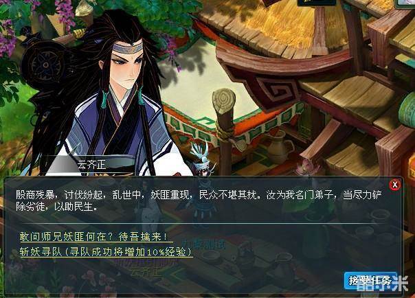 1、组队到斩妖指引师兄云齐正(西岐666,138)处领取任务;