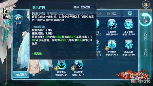 20级技能效果:8秒内每0.66秒造成57%基础攻击+102点水系伤害,同时有40%几率附带0.7秒迟缓效果,冷却时间7.5秒。