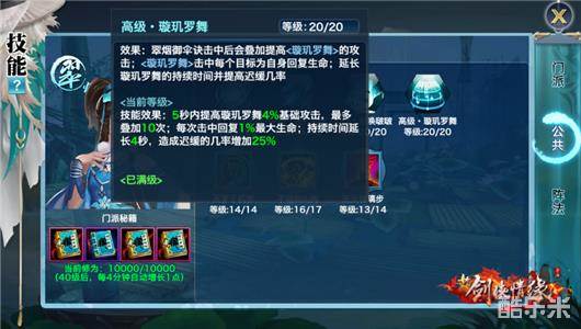 秘籍效果:<翠烟御伞诀>击中后叠加提高<璇玑罗舞>的攻击;<璇玑罗舞>击中每个目标为自身回复生命;延长璇玑罗舞的持续时间并提高迟缓几率。5秒内提高璇玑罗舞4%基础攻击,最多叠加10次;每次击中回复1%最大生命;持续时间延长4秒,造成迟缓的几率增加25%。