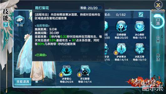 20级技能效果:5秒内每0.33秒对目标所在范围进行攻击,每次攻击造成53%基础攻击+97点水系伤害,同时有60%几率附带1秒的迟缓效果,冷却时间30秒。