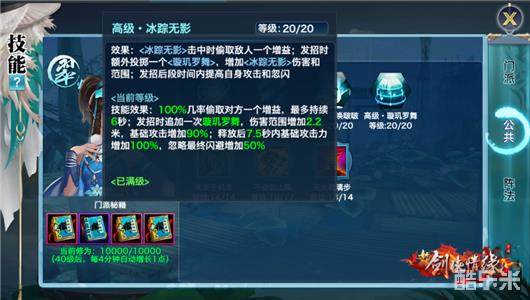 秘籍效果:<冰踪无影>击中时偷取敌人一个增益;发招时额外投掷一个<璇玑罗舞>;增加<冰踪无影>伤害和范围;发招后短时间内提高自身攻击和忽闪。100%几率偷取对方一个增益,最多持续6秒;发招时追加一个璇玑罗舞,伤害范围增加2.2米,基础攻击追加90%;释放后7.5秒内基础攻击力增加100%,忽略最终闪避增加50%。