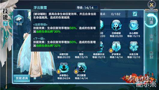5、浮云散雪【被动辅助】提高自身生命回复效率,并且自身当前生命值越高,造成的伤害越高。
