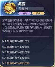 米斯迪受到攻击时,有80%概率为自身施加风遁(增加34%(37%/40%/43%/46%)的反伤率,持续1个行动回合)为自己施加风盾时若已有风盾加持,则转而施加给2名无风盾的友方单位。(风盾不可叠加,多人组队时,友军的风盾一定几率会替换掉已加持的风盾)