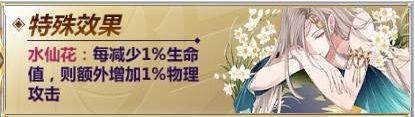 特殊:水仙花(生命):每减少1%生命值 ,则额外增加1%物理攻击。