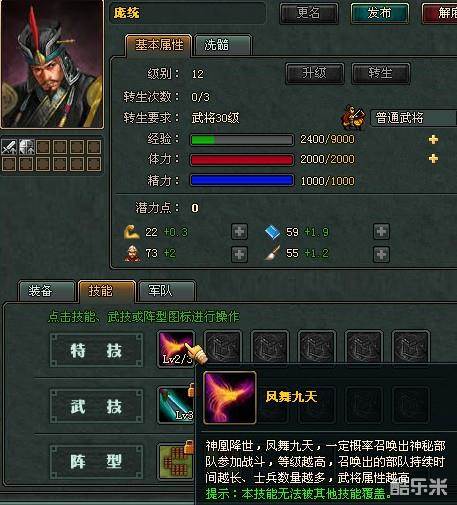 凤舞九天:庞统的绝技,一定概率召唤出神秘部队参加战斗。有一定几率召唤出带有血路、疯马狂奔、奇袭技能的部队,等级越高,召唤出的部队持续回合、士兵数量会有所增加。