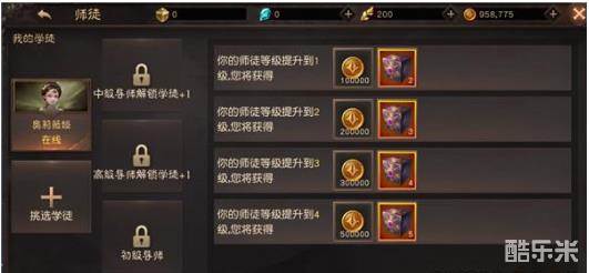 在导师和徒弟一起升级和经历战斗后,导师等级能够得到提升,可以获得丰厚奖励;当学徒在自己从师期间达到30,40,50级时,也能够获得大量的成长奖励;在从师的期间学徒每升一级,导师也有奖励哦!