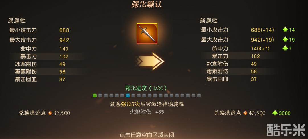 强化后的装备在商贸区的神秘遗迹处,可以兑换到更多的遗迹点数。所以,如果有不用的装备想要兑换掉,不妨在兑换之前先进行几次强化。在强化结果界面中,也可以看到强化前后,装备分别能兑换多少遗迹点数。