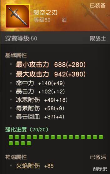 某些装备上会拥有强大的神谕属性,需要装备强化过一定次数后方能激活。例如,上图的装备,在强化后成功激活了神谕属性:火焰附伤加成。
