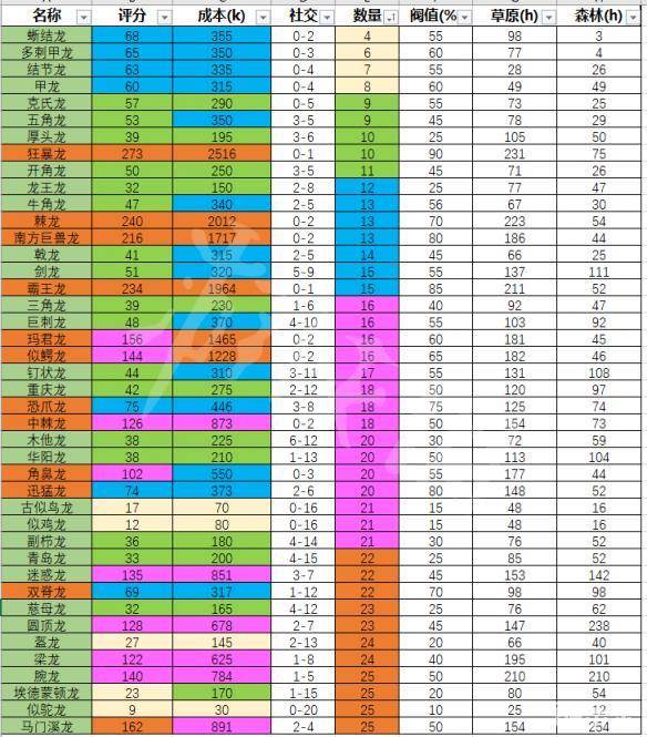 饲养恐龙主要分为五档,上限分别是4只、9只、12只、16只、22只,都以圈内最少上限为标准,由于18只上限里面的木他龙特别尴尬至少需要六只来满足社交,所以建议不培养或者分两个分别放置这个阶段的恐龙,9只上限里面五角龙成本高评分低而且要求三只满足社交,不建议使用,就可以满足9只的上限里面的其他龙都可以放。具体数据看图片吧。里面数据都是基础值,改基因未列入。