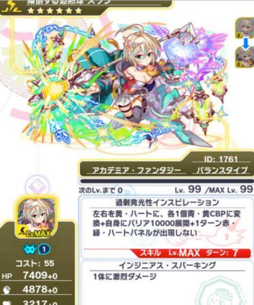 限定标配三围,主动7cd,左右分别转黄珠和心珠,同时各一个蓝cbp、黄cbp(消除珠)生成,自身生成10000的AT盾,一回合绝红/绿/心,cs是破格的一体激烈,被动双对策,免毒+障碍珠无视并破坏。