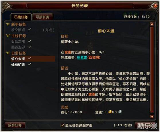 西岐城最近出现了传说中的骠龙六盗,现全西岐正张榜通缉此六盗。骠龙六盗均藏匿在【西岐城】中,该任务没有寻路,只有根据任务文字线索搜索疑犯。