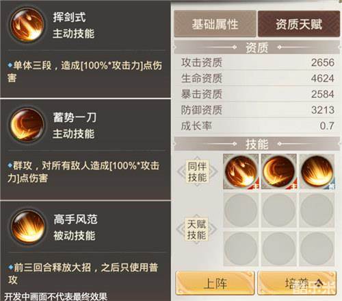 天赋技能的选择就变得极为重要。建议天赋技能选择速战速决、势如破竹、增兵减灶、金戈铁马、暴伤、强攻等增强攻击力和暴击的技能。这样可以使蒙嘉在前三回合打出极高的输出。