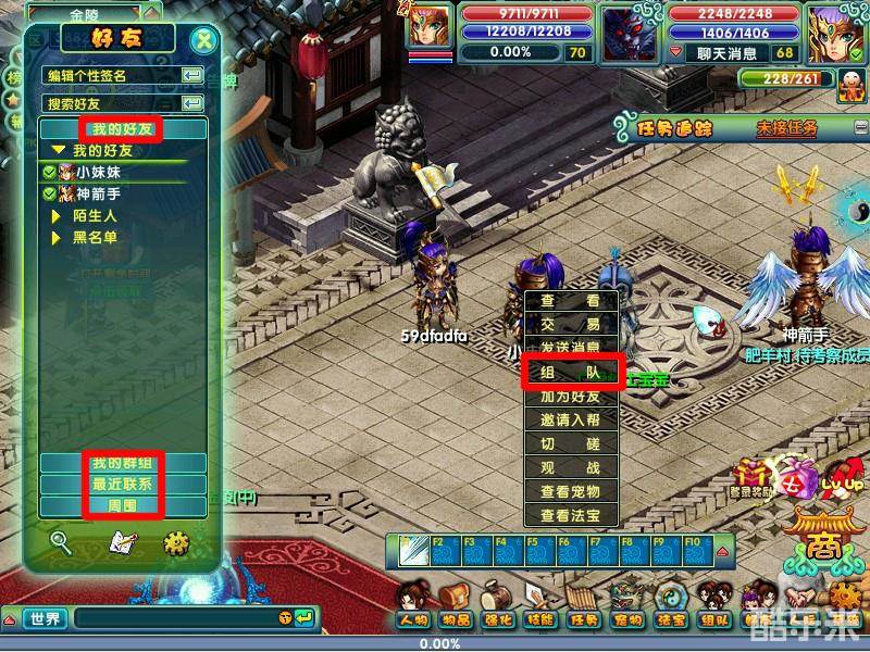 可以直接点击其他玩家,当你是队长时组其他玩家入队,当你不是队长时候则是申请入队请求。也可以在好友列表、帮派列表、周围、最近联系右击点击选择组队或入队。
