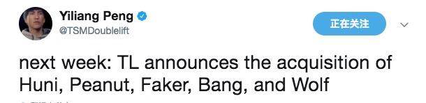 下周:TL宣布买入Huni、Peanut、Faker、Bang和Wolf