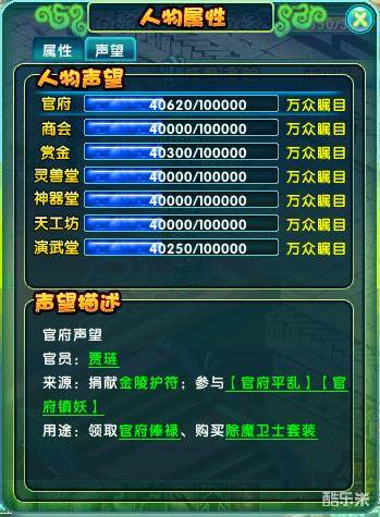 目前声望共分7类:官府、商会、赏金、灵兽堂、神器堂、天工坊和演武堂。在“人物信息-人物属性”界面中可以查看到各司声望信息。(快捷键ALT+C)