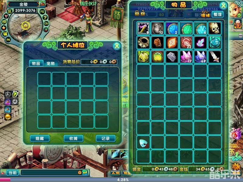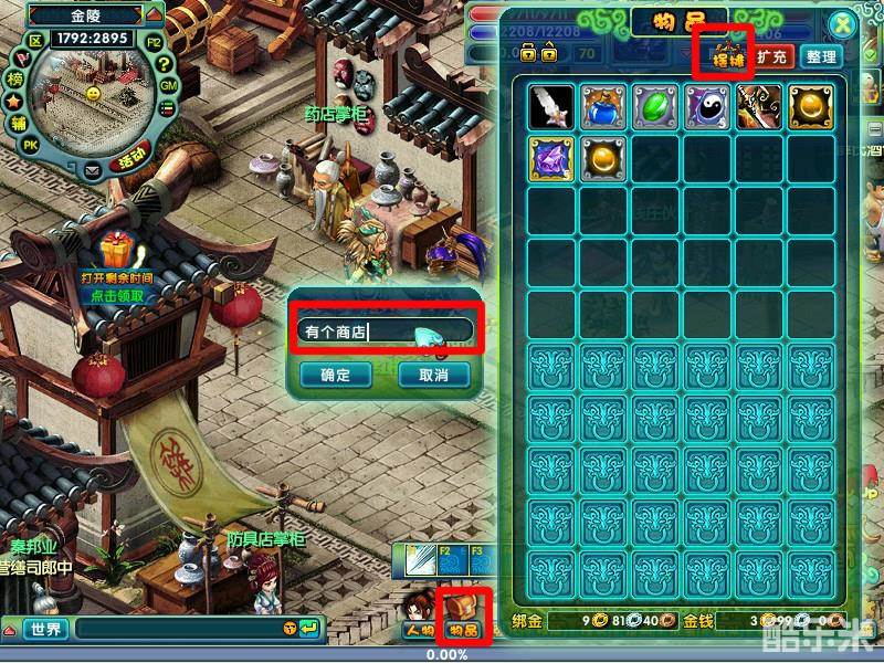 1、目前游戏中只能够在金陵城中摆摊,需要出售物品时,进入金陵城地图,选好位置,打开物品栏,点击背包栏右上角 “摆摊”按钮进行摆摊。
